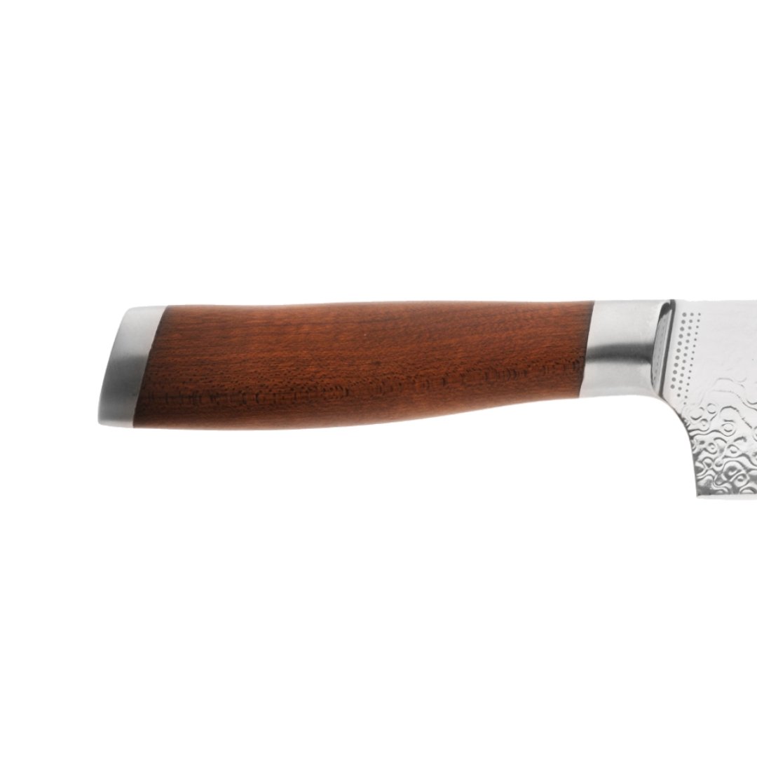 Der Griff aus norwegischem Eisen-Ahorn ist nicht nur ein Hingucker, sondern auch praktisch: Er bleibt stabil, egal wie feucht die Küche ist. Perfekt für Profis und ambitionierte Hobbyköche!