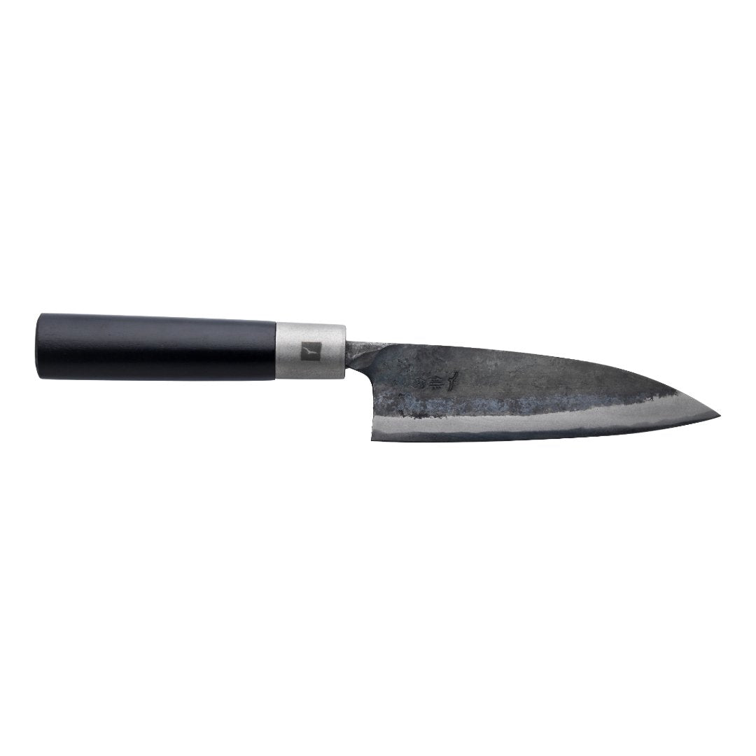 Haiku Kurouchi Messer gehören zu den sogenannten Takumi Messern. Takumi bedeutet Meister. Die Besonderheit der Kurouchi Messer liegt in den Klingen, die schwarz geschmiedet werden und so einen Ur-Messer Charakter erhalten. Der Klingenkern besteht aus besonders hartem blauen Aoko Stahl, der zur besseren Flexibilität und Stabilität mit weicherem Eisen ummantelt ist. Die sehr flach ausgeschliffenen Klingen, mit 61 Grad Rockwell Härte, sind extrem scharf und garantieren eine sehr lange Standzeit der Schneide. Griffe aus schwarz lasiertem Magnolienholz und Edelstahlzwingen vollenden diese außergewöhnlichen Messer.