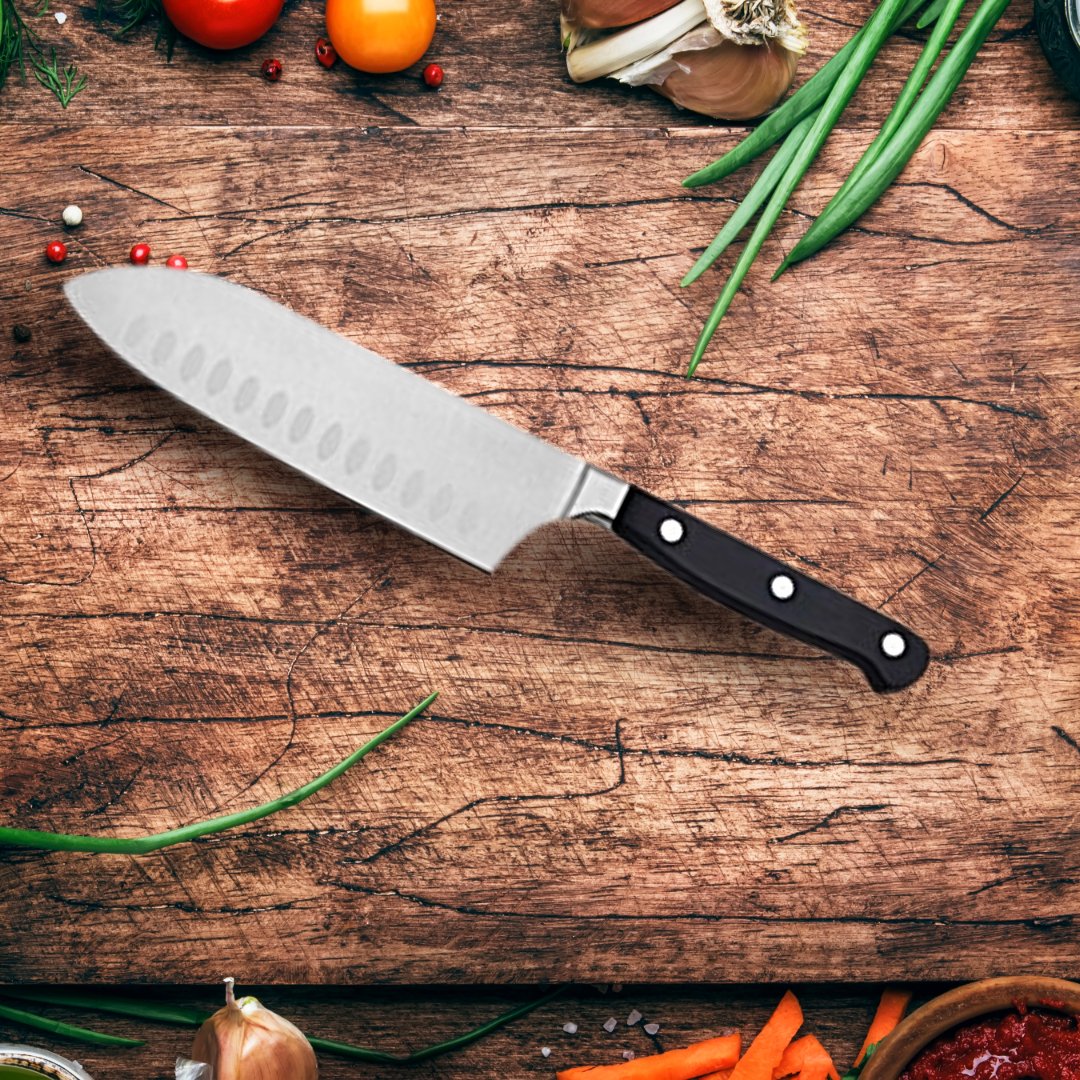 Das Santokumesser aus der KochKraft Serie ist Ihr Allrounder in der Küche. Mit seinem Kullenschliff verhindert es das Anhaften von Lebensmitteln an der Klinge und sieht zudem auch super stylisch aus!