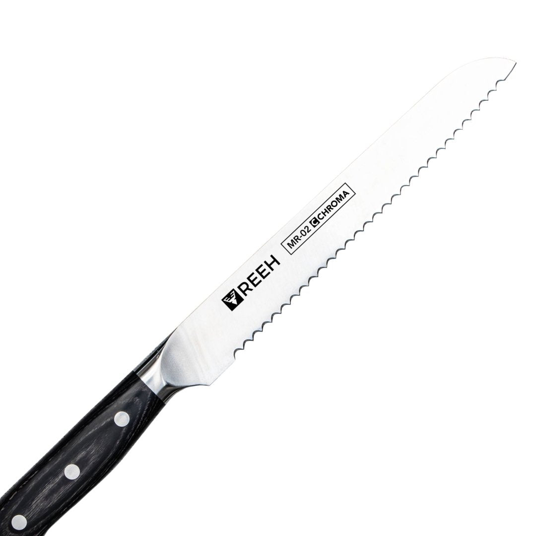 Gemeinsam mit den japanischen Messerexperten hat Mirko Reeh die REEH by Chroma Serie entwickelt, die sich ideal für Einsteiger eignet. Diese Messer sind ein echter Hingucker! Der Griff ist nicht nur stylisch, sondern auch super pflegeleicht und langlebig. Die Klingen bestehen aus hochwertigem, eisgehärtetem Stahl und sind mit einem japanischen V-Schliff versehen, der für rasiermesserscharfe Schnitte sorgt. Egal ob du gerade erst anfängst oder schon ein Profi bist – die REEH Serie hat das richtige Messer für dich.