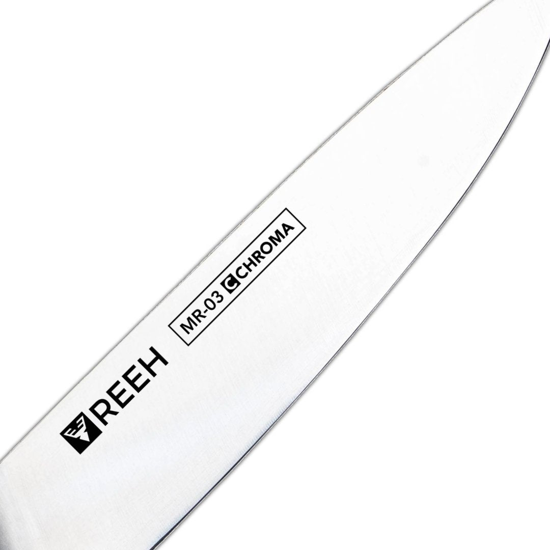 Gemeinsam mit den japanischen Messerexperten hat Mirko Reeh die REEH by Chroma Serie entwickelt, die sich ideal für Einsteiger eignet. Diese Messer sind ein echter Hingucker! Der Griff ist nicht nur stylisch, sondern auch super pflegeleicht und langlebig. Die Klingen bestehen aus hochwertigem, eisgehärtetem Stahl und sind mit einem japanischen V-Schliff versehen, der für rasiermesserscharfe Schnitte sorgt. Egal ob du gerade erst anfängst oder schon ein Profi bist – die REEH Serie hat das richtige Messer für dich.
